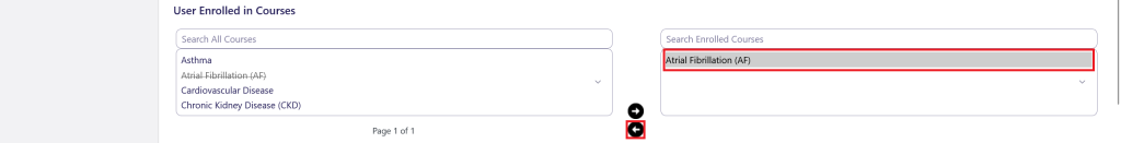 Press the arrow pointing to the left-hand column. The Course should now show in the left-hand column without a line through it and it should be removed from the right-hand column.
